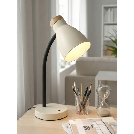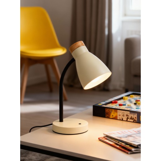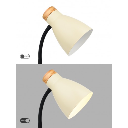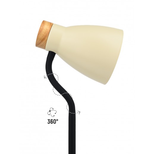 Источник света — лампа с цоколем Е27 Качественный металлический корпус с декоративным элементом из дерева Эксклюзивные цвета Удобно настраиваемое положение плафона Удобный выключатель на подставке